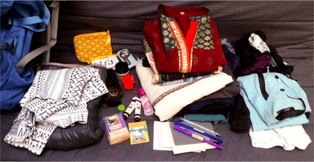 Cette année, je me prépare à 80 jours non planifiés, entre le Sri Lanka, le Bangladesh et l’Inde. 30 litres de sac à dos, 4 kurtas, 3 pantalons, 7 culottes, 7 paires de chaussettes, 10 livrets de feuilles de savon, du samahan, du javadhu, du shikkakai, des carnets et des crayons.